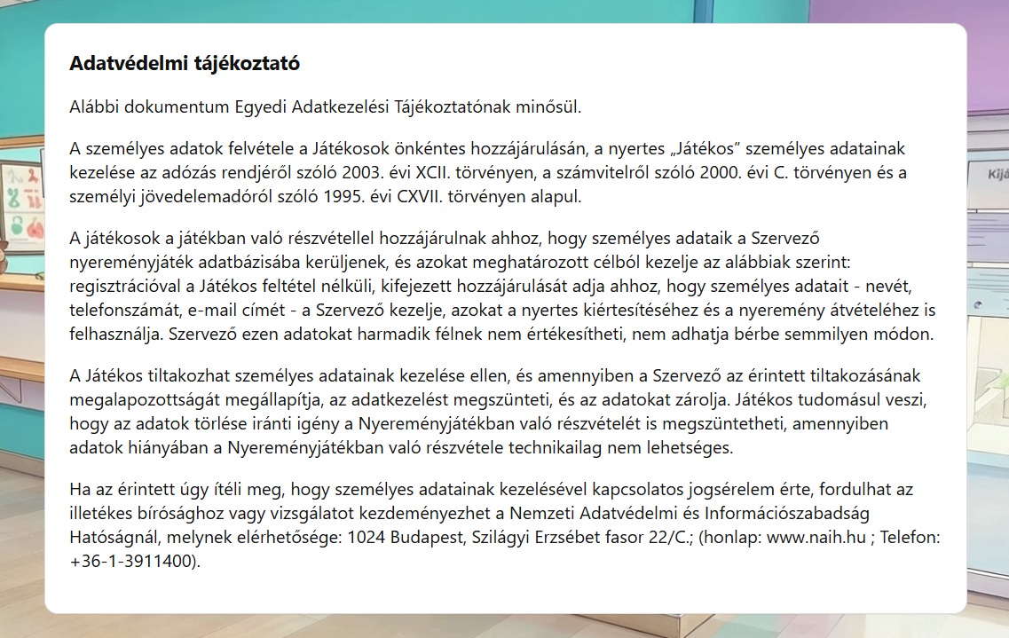 A játékos téves adatszolgáltatásából eredően a Szervezőt semmilyen felelősség nem terheli.