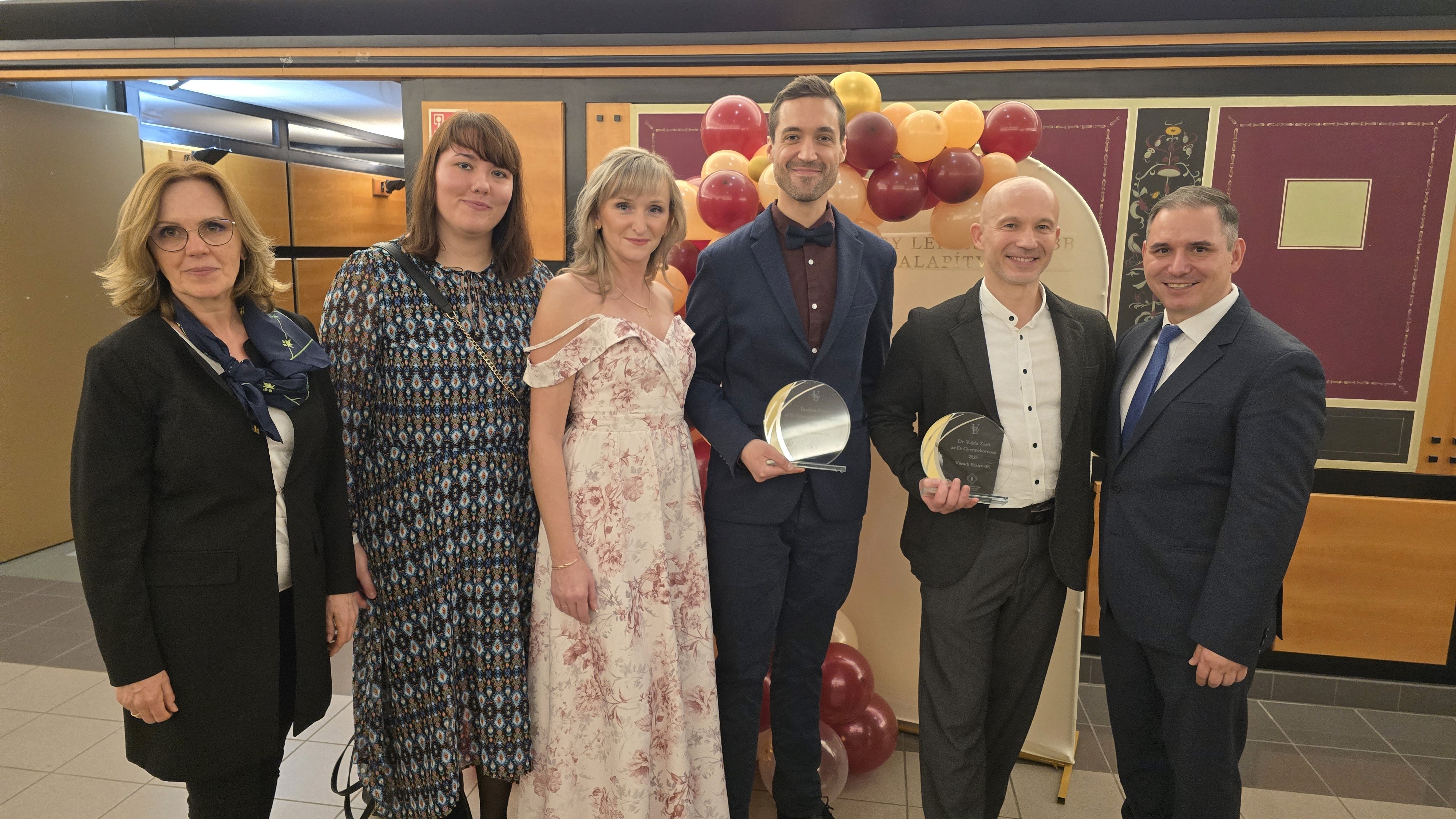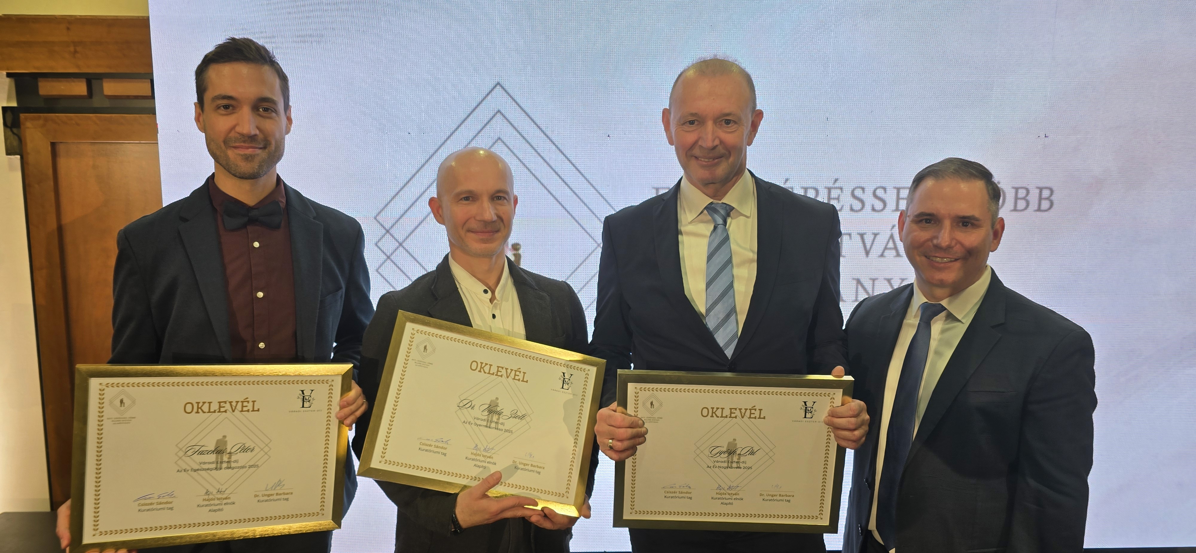 Nagy örömmel és büszkeséggel osztjuk meg a hírt, hogy idén két kiváló munkatársunk, Dr. Vajda Zsolt osztályvezető főorvos és Fazekas Péter sürgősségi APN okleveles ápoló elnyerte a rangos Váradi Eszter-díjat, amelyet minden évben azok a szakemberek kapnak, akik kiemelkedő szakmai teljesítményükkel, emberi hozzáállásukkal és példamutató hivatástudatukkal méltán képviselik a magyar gyermekegészségügy értékeit.